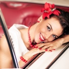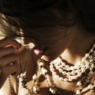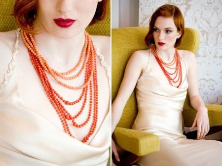 מראה מדהים בסגנון רטרו, כמובן, לא יסתדר בלי אביזרים מתאימים. לכן את שמלת המשי בצבע שנהב משלימים חרוזי אלמוגים רב-שכבתיים, שפרטיהם בגודל בינוני, כך שהם נראים מאוד מסודרים ומתוחכמים.