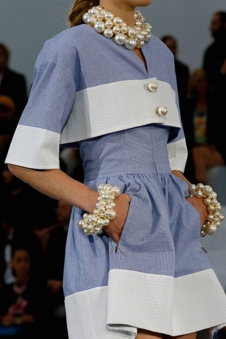קשת אופנתית עם אביזרים יוצאי דופן תנצנץ עם צבעים חדשים. חליפת קיץ, המורכבת משמלת קיץ מכותנה וז'קט קצוץ, עשויה מאותו החומר, נראית נהדר עם חרוזים קצרים רב-שכבתיים העשויים מפנינים דקורטיביות גדולות. אם תרצה, ניתן להשלים את התלבושת עם צמידים מסיביים מאותה קולקציה.